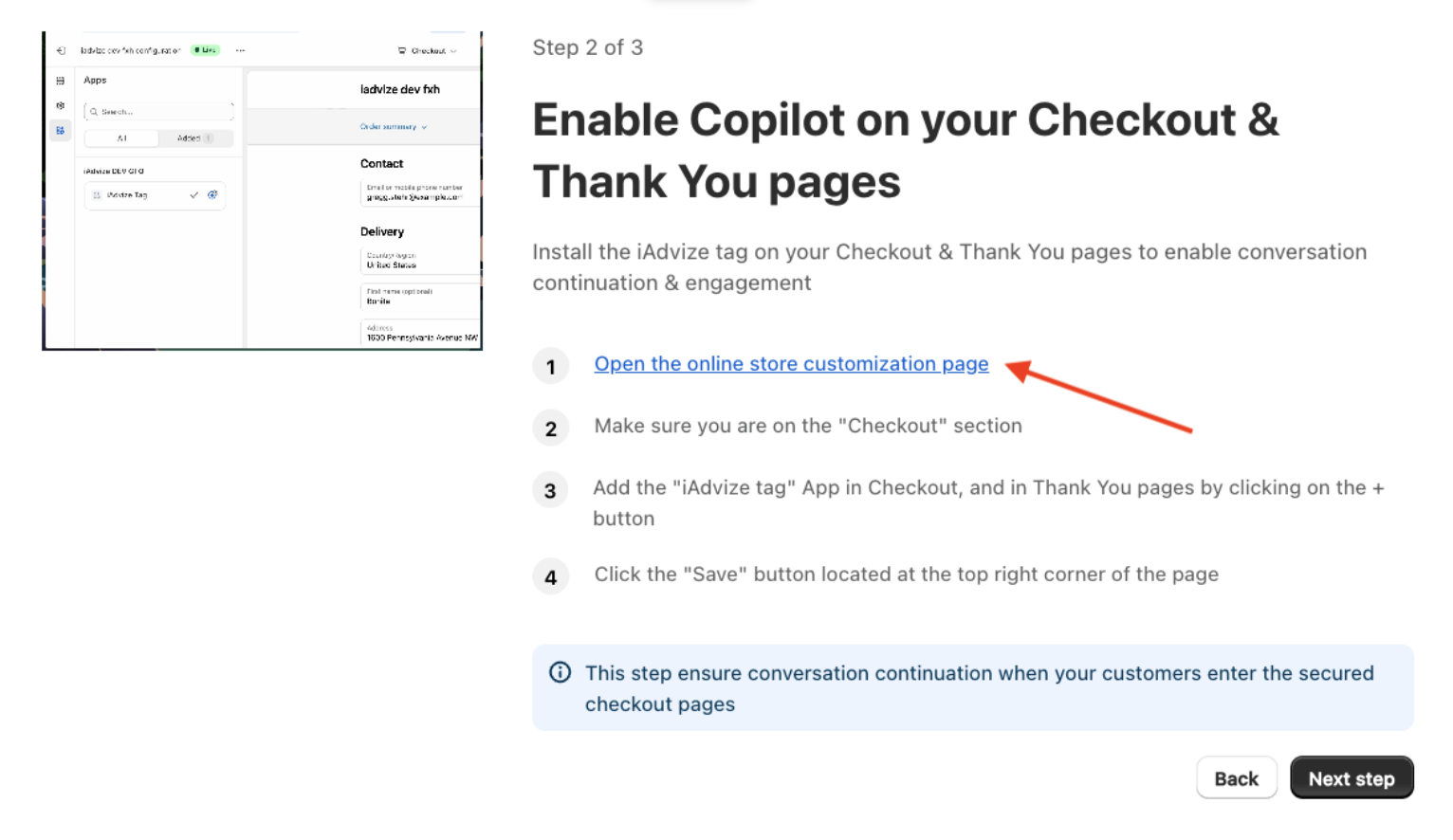 Cette deuxième étape permet d’afficher votre Copilot sur les pages de paiement et de remerciement.