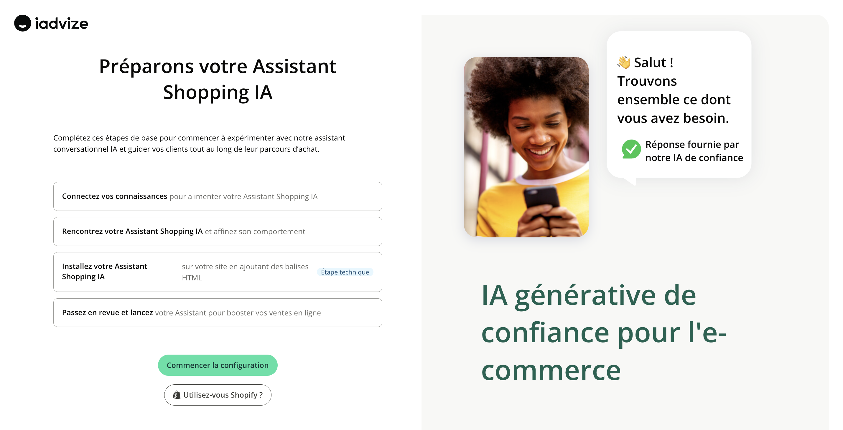 Ce guide vous explique comment connecter votre boutique Shopify à iAdvize pour activer l’Assistant Shopping IA sur votre site e-commerce en quelques clics.