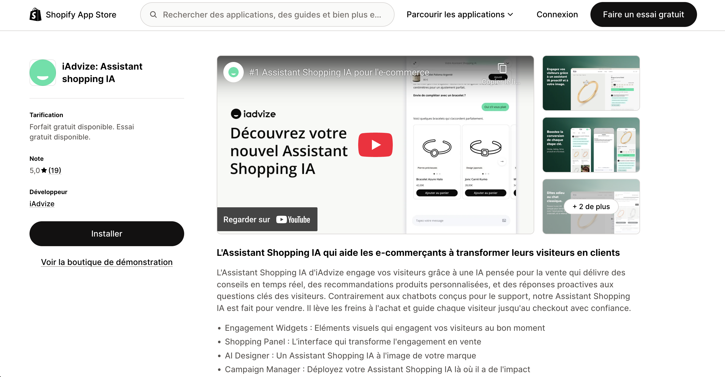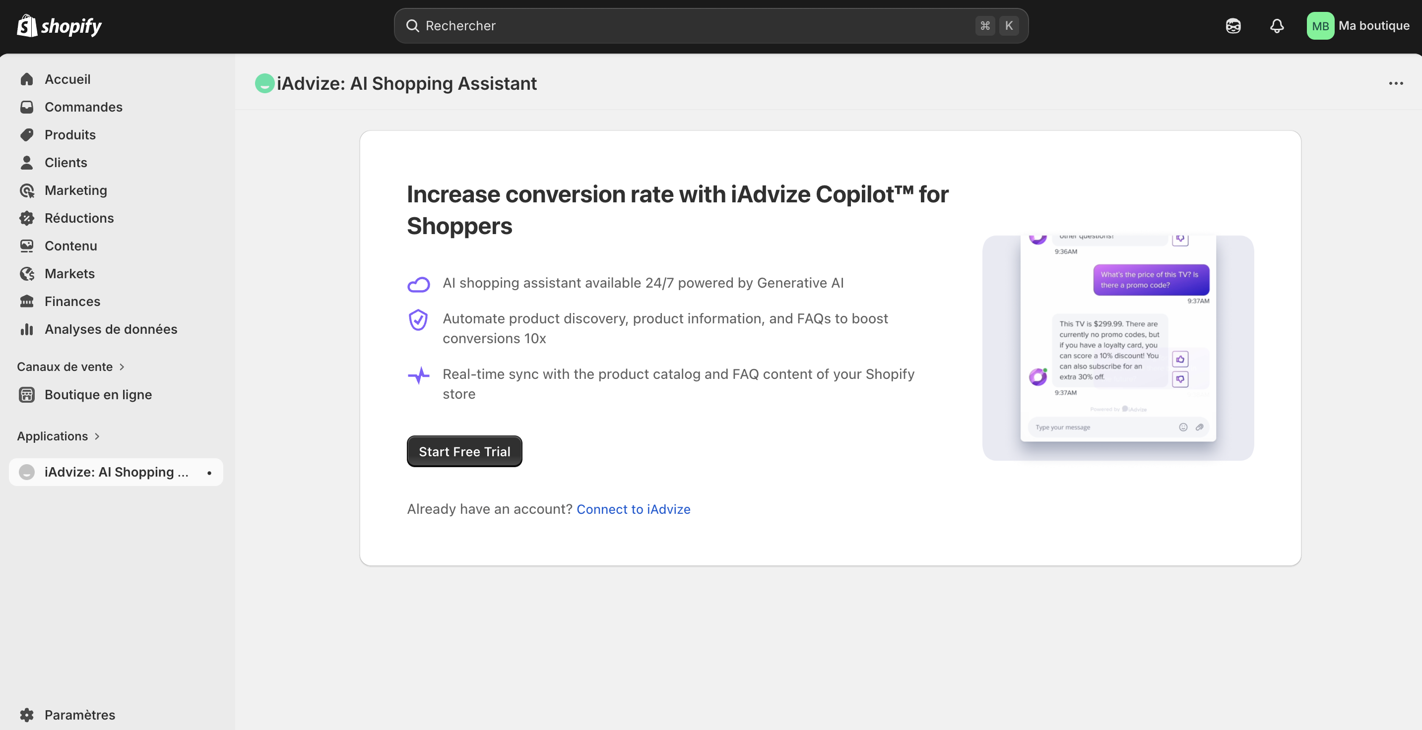 Ce bouton vous ouvrira automatiquement la fiche de l’application iAdvize sur le Shopify App Store.