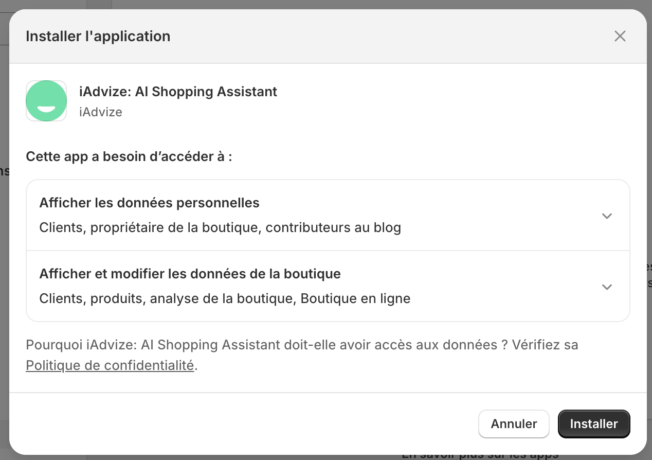 Autorisez iAdvize à accéder aux données produits et variantes de votre boutique, cliquez sur Installer :