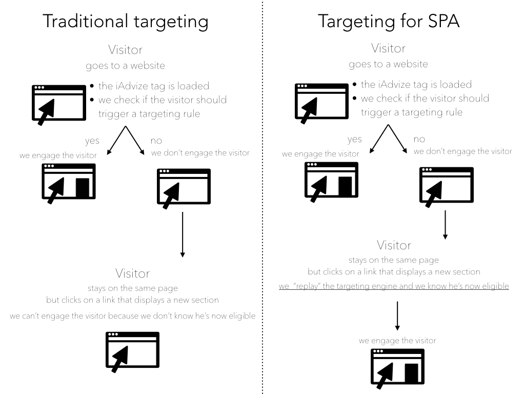 Seulement, jusqu'ici notre moteur de ciblage s'exécutait au chargement de la page et vérifiait à ce moment là si les conditions étaient réunies pour engager le visiteur. iAdvize n'était donc pas compatible avec ces sites qui ne se chargent qu'une fois car on ne pouvait vérifier que le visiteur correspondait à une règle de ciblage qu'une fois, au chargement de la page.