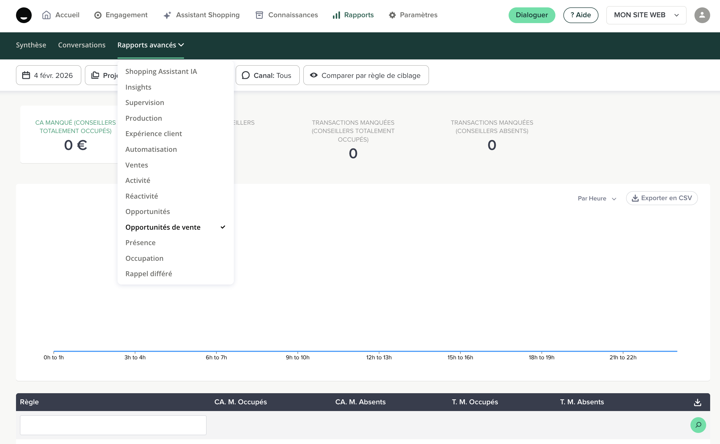 Le rapport Opportunités de vente vous permet d’analyser les pertes de chiffre d’affaires liées aux opportunités de transactions manquées. Grâce à ce rapport, vous pouvez identifier les moments où vos conseillers étaient absents ou occupés et ajuster leur disponibilité pour maximiser vos ventes.