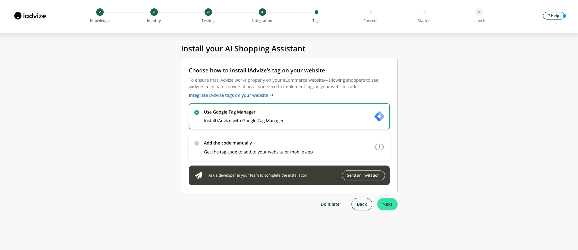 Si vous souhaitez transmettre à votre développeur ou à votre agence toute la documentation nécessaire, cliquez sur Envoyer une invitation. Un email avec toutes les instructions sera envoyé, sans besoin d'accéder à l'administration iAdvize.