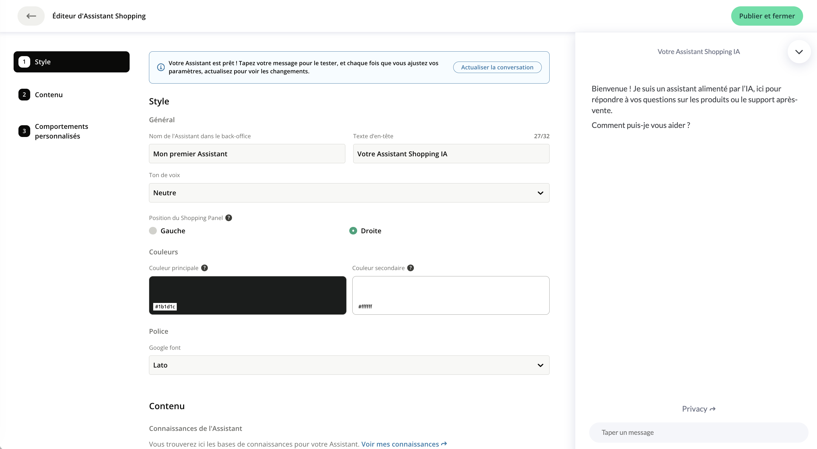 - Couleurs : principale correspond aux messages des visiteurs, secondaire concerne la bordure des suggestions générées par votre Assistant