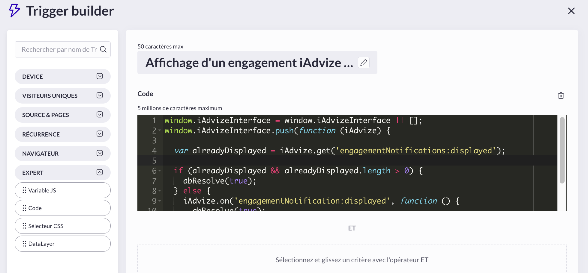 - Trigger(s) : sélectionnez le Trigger “Affichage d’un engagement iAdvize”