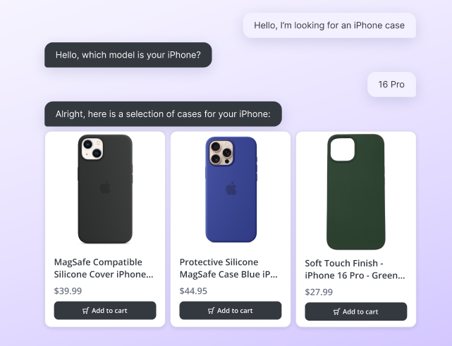 Votre Copilot guide vos visiteurs vers les produits compatibles, en posant les bonnes questions dès le départ.