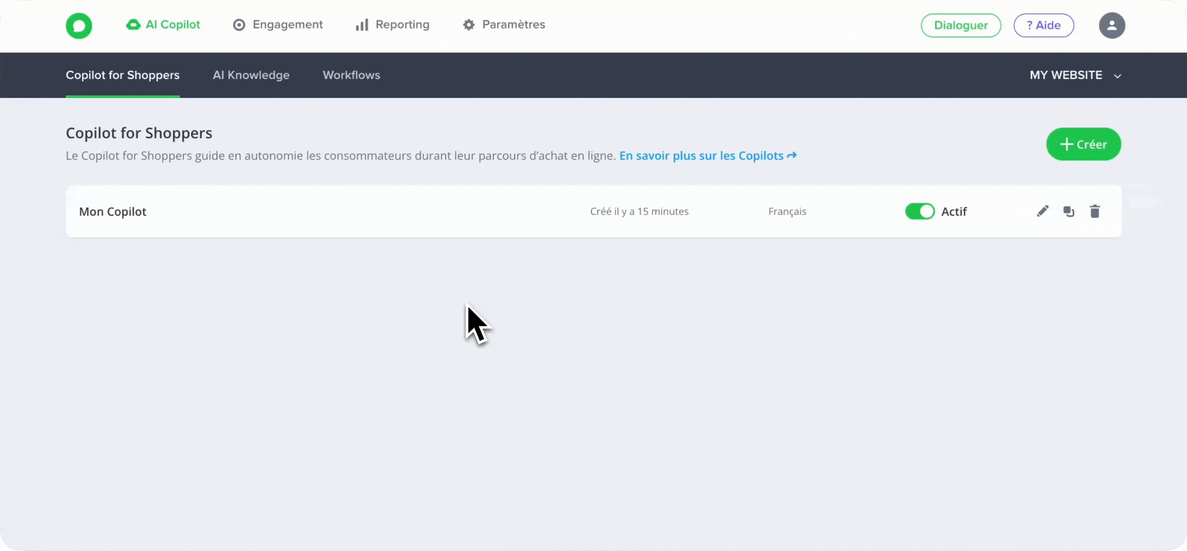 - Dans l’onglet AI Copilot > éditez votre Assistant pour accéder à l’aperçu :