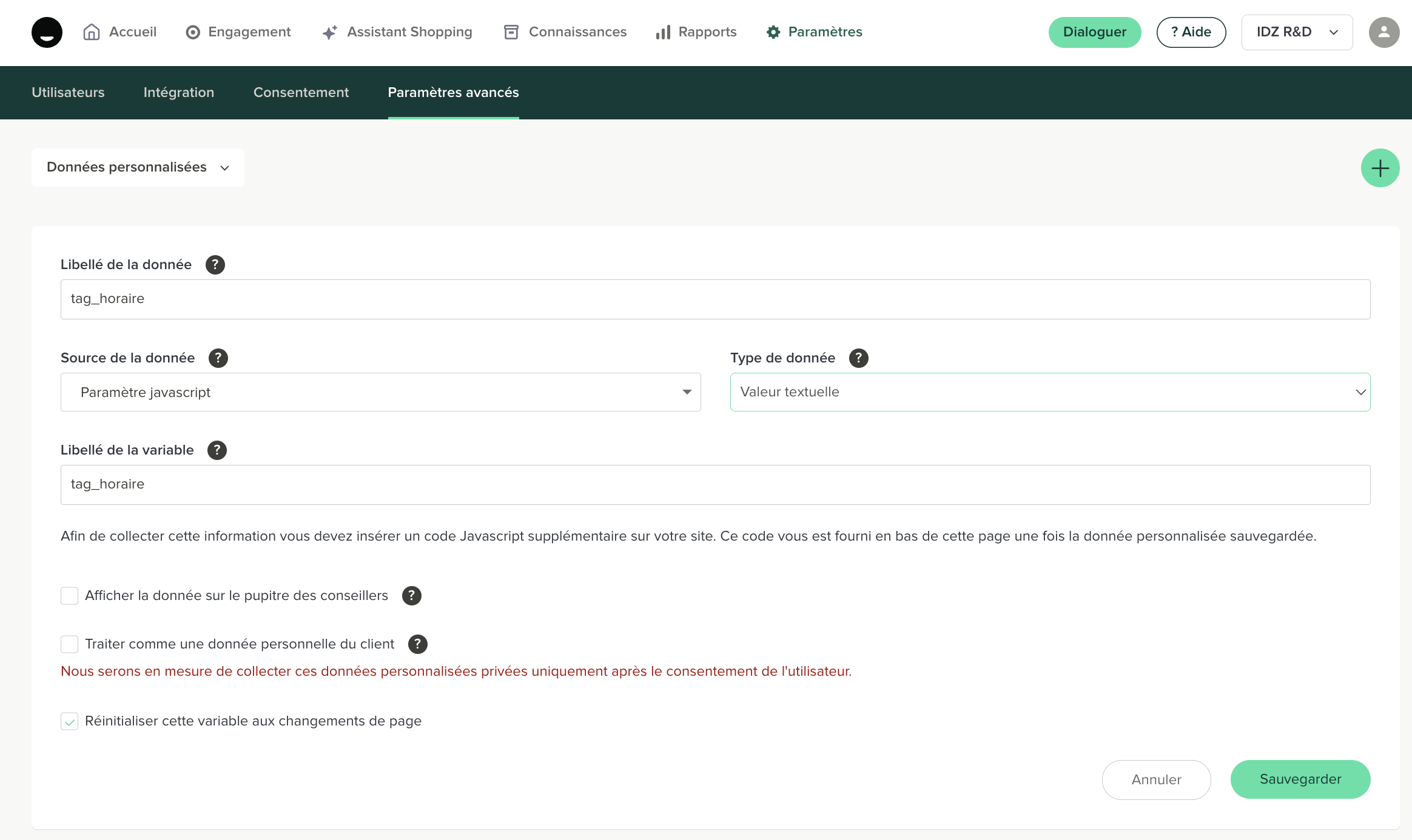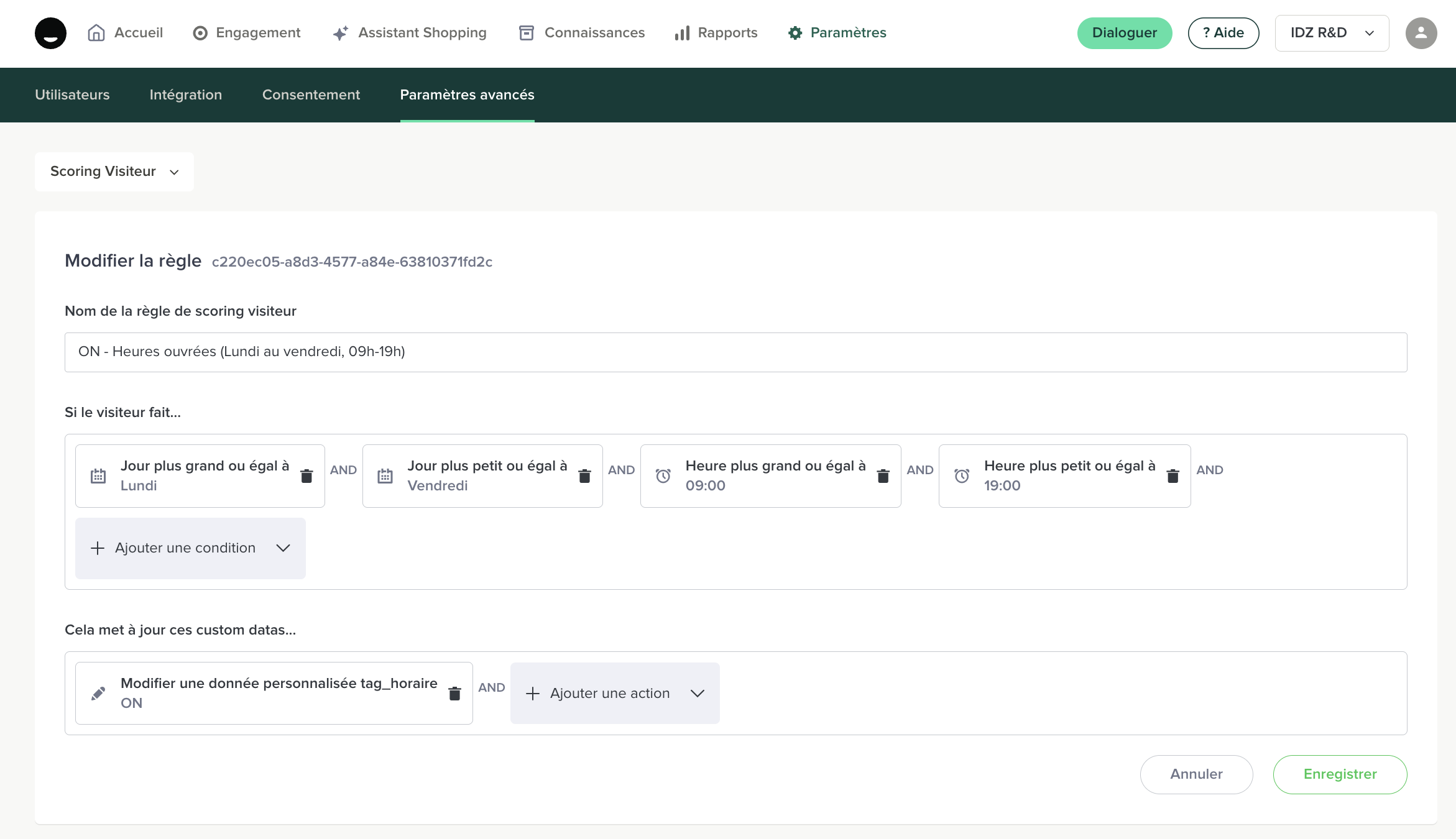 Le tag horaire repose sur une donnée personnalisée (custom data) alimentée automatiquement par des règles de Scoring Visiteur.