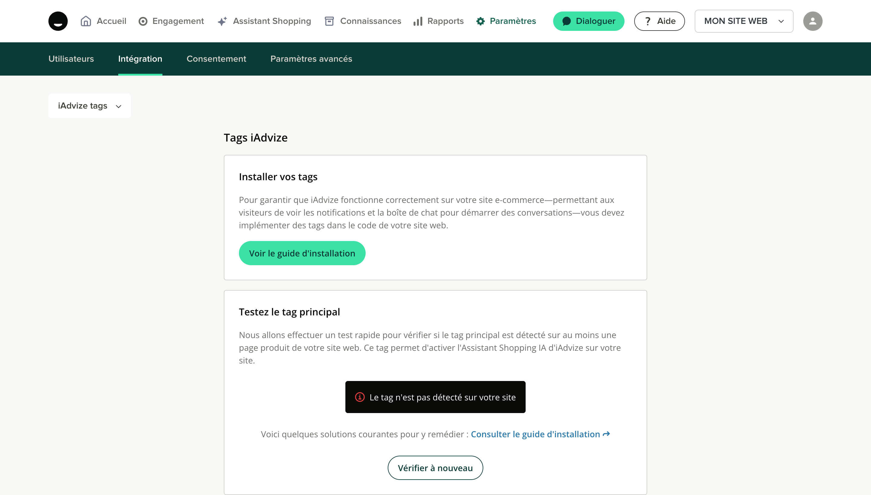 Accédez à l'onglet Paramètres > Intégration > iAdvize tags puis cliquez sur Voir le guide d'installation