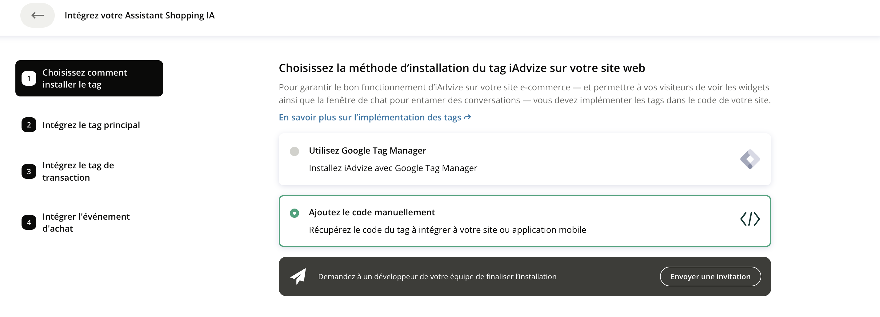 Si vous souhaitez transmettre à votre développeur ou votre agence toute la documentation nécessaire, cliquez sur Envoyer une invitation. Il recevra un email avec les instructions, sans besoin d'accéder à l'administration iAdvize.