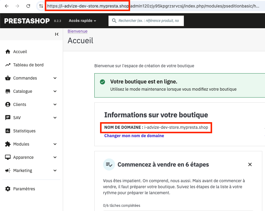 - Toujours depuis l'écran d'accueil de votre administration Prestashop, vous trouverez l'URL de votre instance affichée dans la barre d'adresse