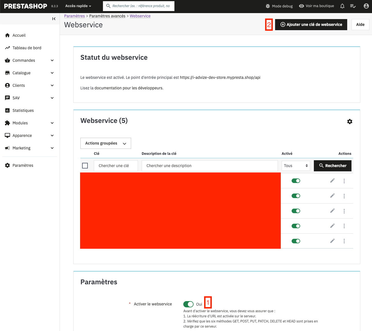 https://i-advize-dev-store.mypresta.shop, votre URL de base API sera https://i-advize-dev-store.mypresta.shop/apiCréer et récupérer votre clé API Prestashop