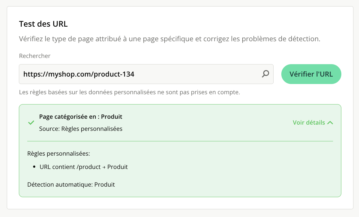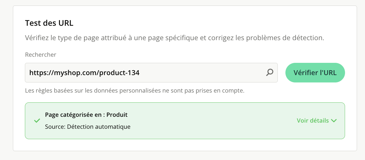 L'outil de test des URL vous indique à quel type de page est attribué l'URL renseignée afin d'effectuer des vérifications.