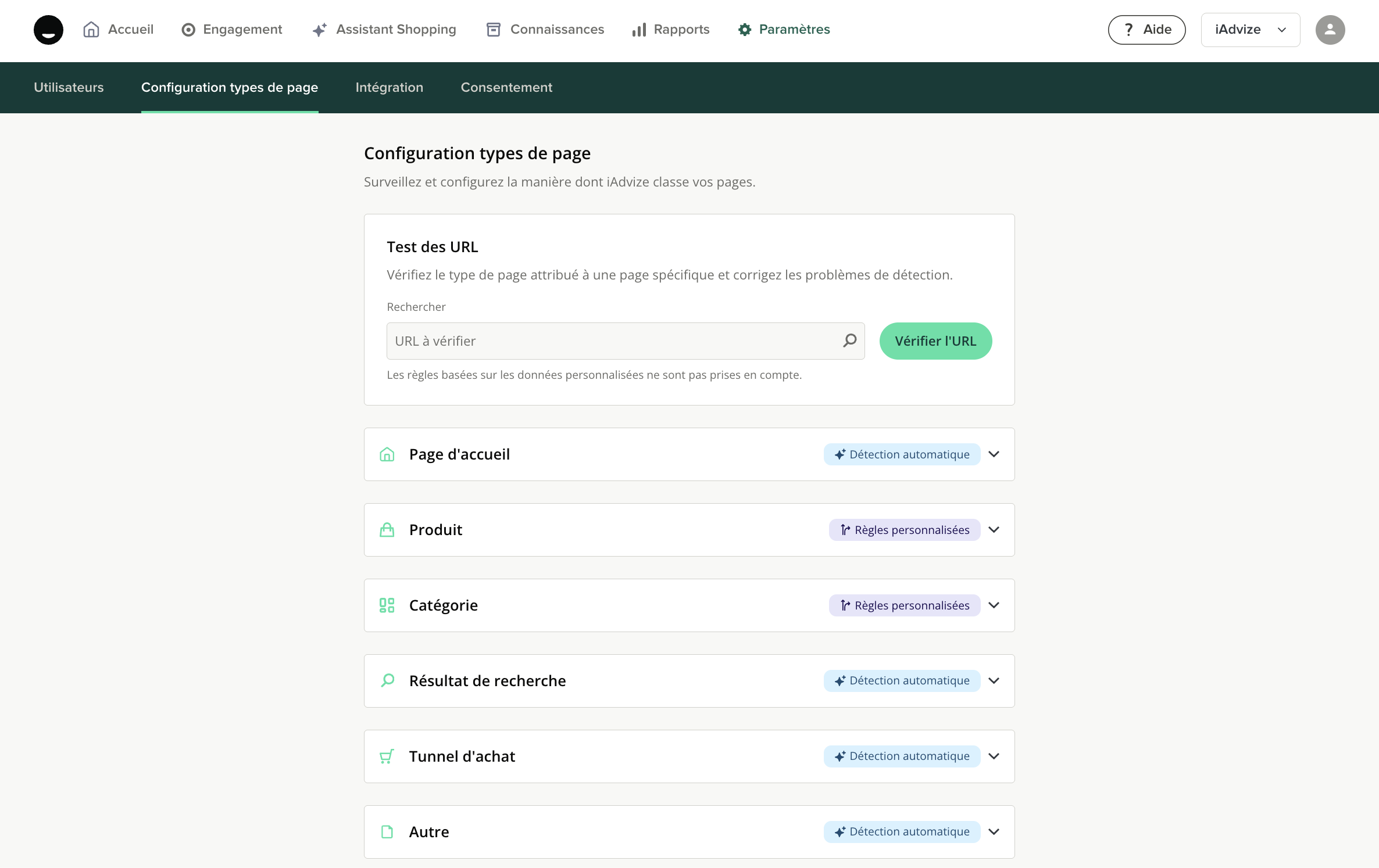 Les types de pages (Accueil, Catégorie, Produit etc.) permettent de cibler précisément où votre Assistant Shopping IA s'affiche. iAdvize détecte automatiquement le type de page visitée mais vous pouvez aussi créer des règles manuelles pour corriger ou compléter cette détection.
