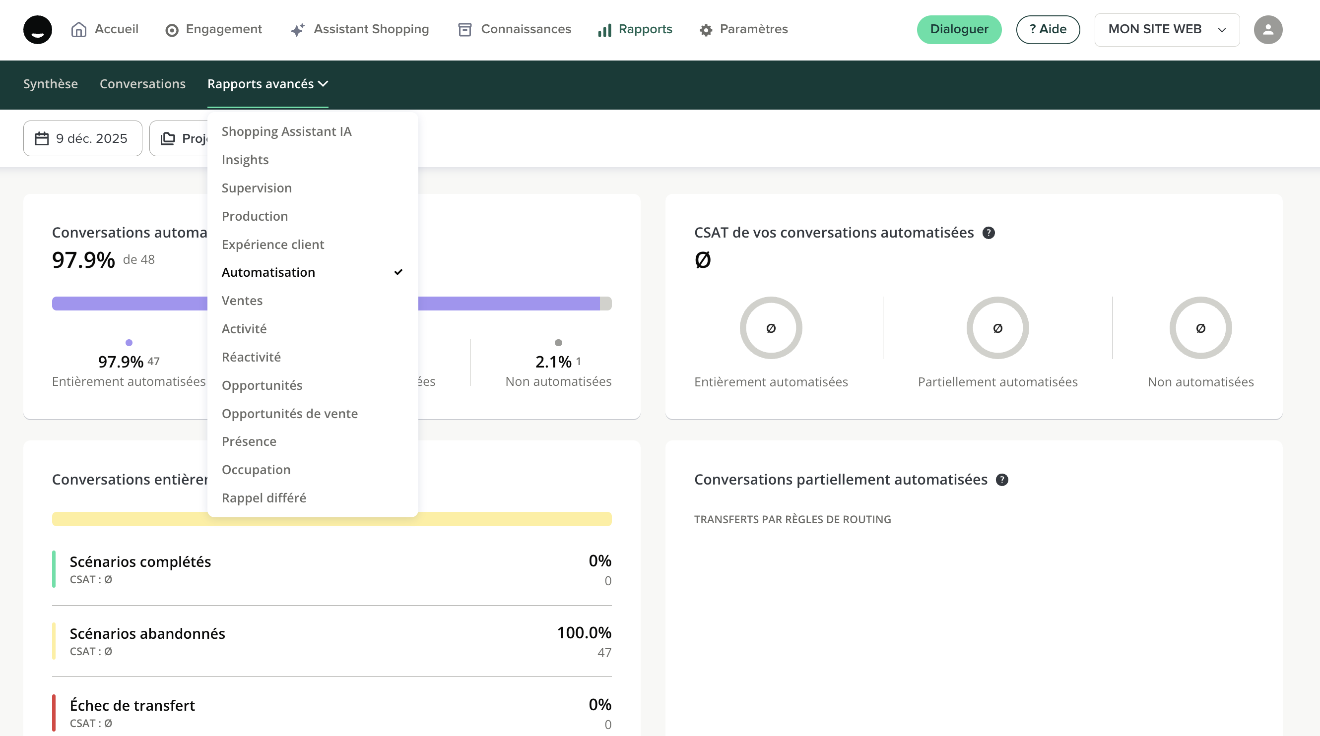 Pour les conversations entièrement automatisées, il donne plus de détails sur la façon dont les robots et les clients ont géré la conversation. Ont-ils atteint la fin du scénario ? Ont-ils arrêté la conversation ? Les bots n'ont pas transmis la conversation à un humain ?