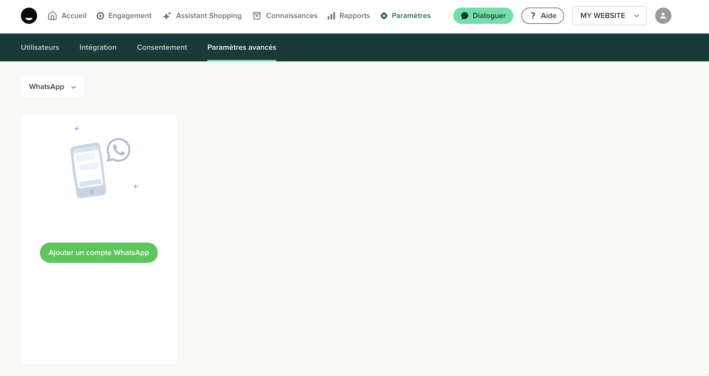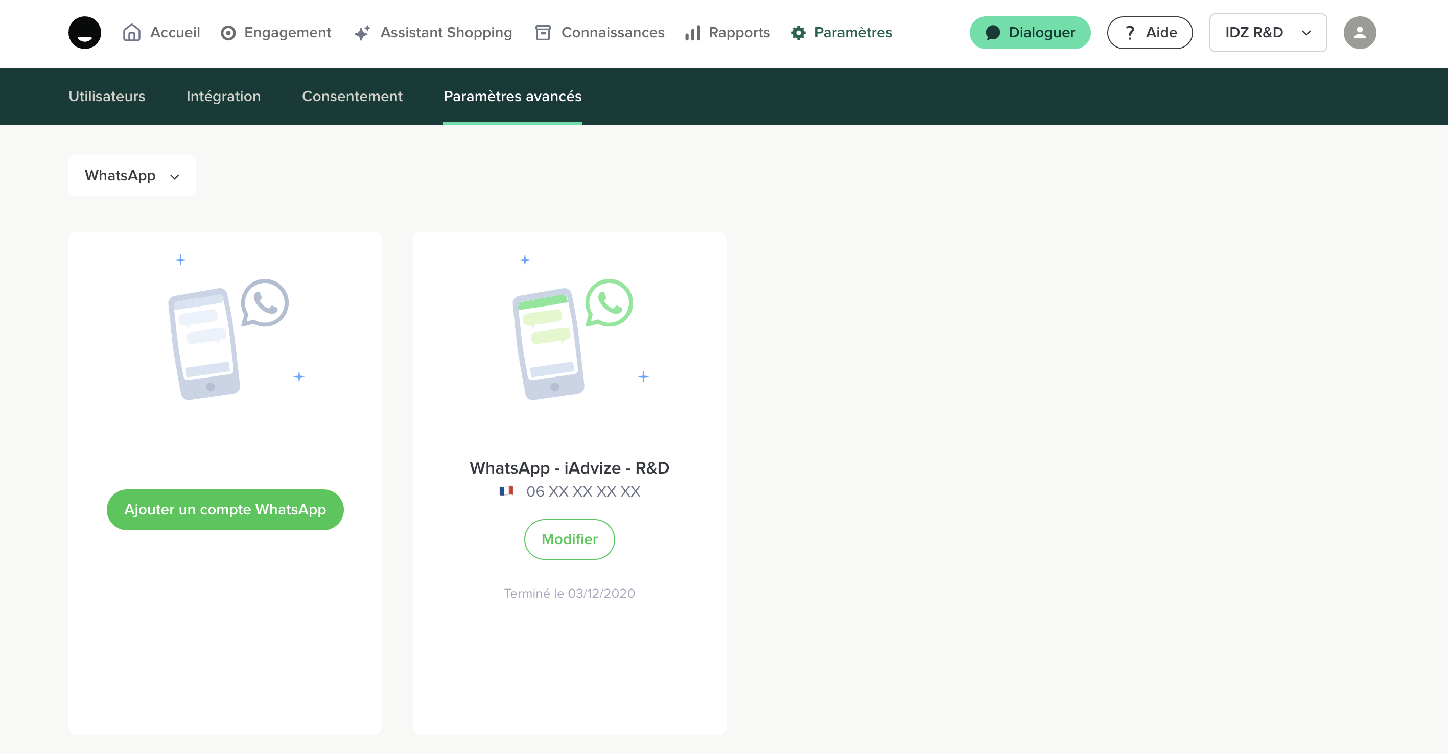 Après avoir sélectionné le projet pour lequel vous souhaitez activer WhatsApp dans l'administration iAdvize :
