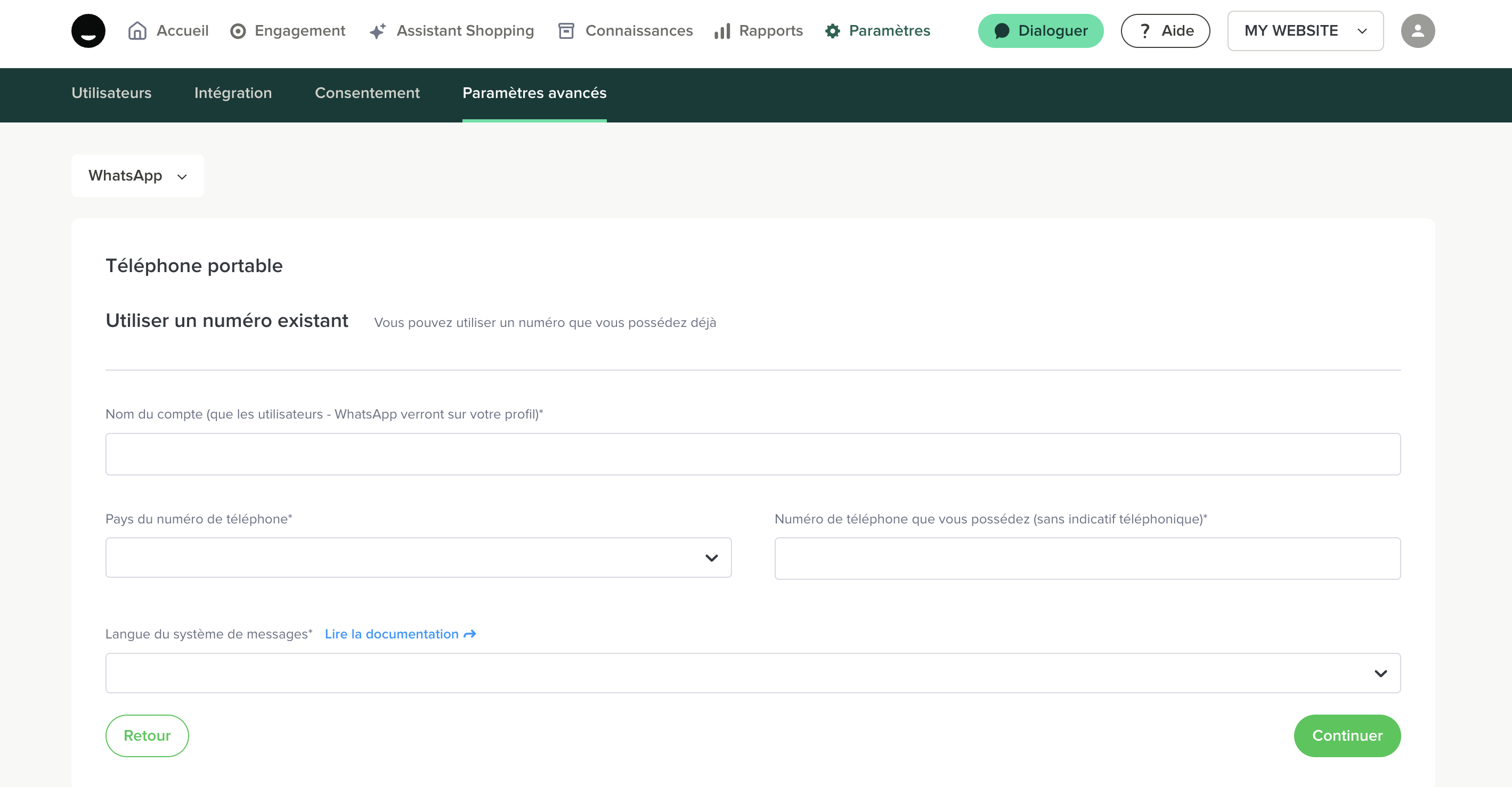 Sélectionnez le System language. Cette langue sera utilisée pour envoyer les messages template au visiteur, cliquez ici pour en savoir plus. Cette langue ne s’applique ni à l’agent qui va traiter la conversation, ni au visiteur qui enverra des messages.
