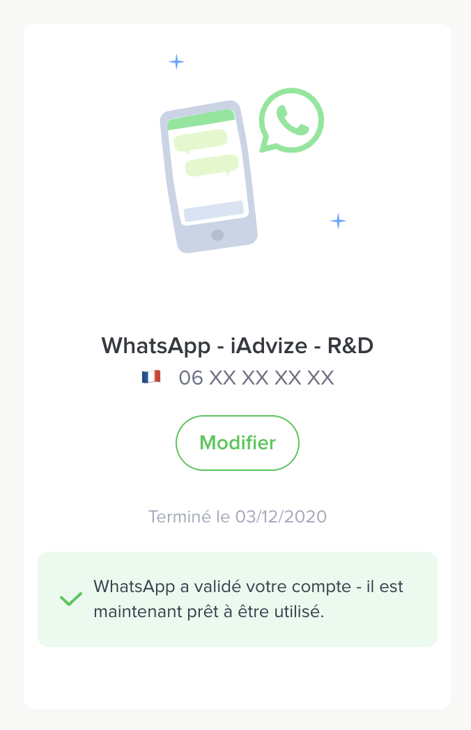 Une fois que toutes ces étapes sont effectuées, votre compte est soumis pour review à WhatsApp. Vous serez tenu au courant de l’état de votre demande dans l'onglet WhatsApp.